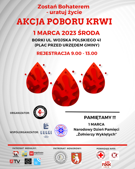 AKCJA POBORU KRWI w Borkach w środę 1 marca 2023 r. ZAPRASZAMY !!!!