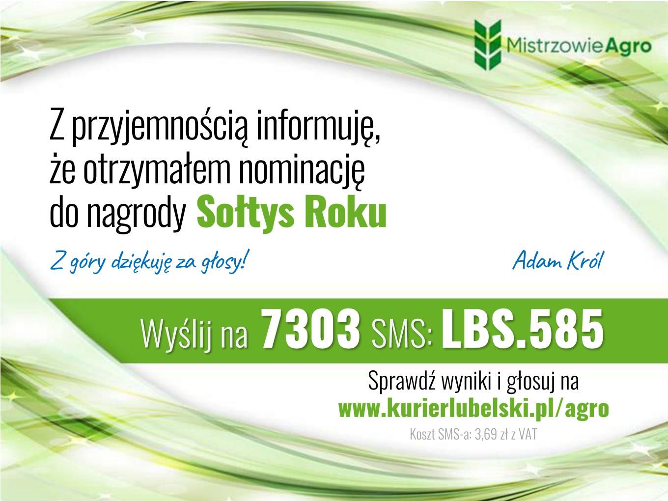 Szanowni mieszkańcy zostałem nominowany do nagrody Sołtysa Roku prowadzonej przez redakcję Kuriera Lubelskiego w akcji Mistrzowie Agro 2023. Proszę o Wasze głosy , które można wysyłać od 12 kwietnia do 17 maja 2023 r. pod wskazny niżej nr telefonu.